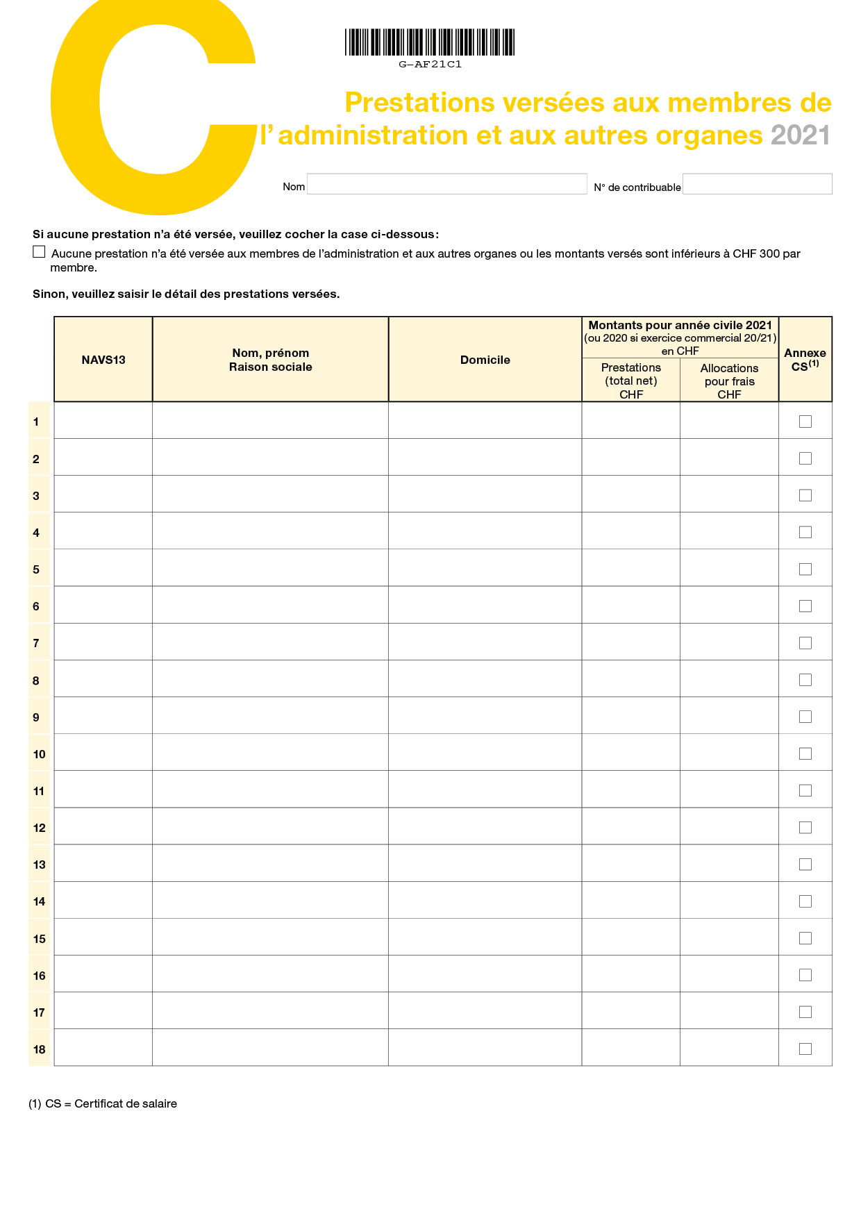 La formule 12 servant habituellement d’attestation ne doit plus être remplie. Dorénavant et par mesure de simplification administrative, il suffit d’annexer une copie du certificat de salaire à l’annexe C pour chaque membre de l’administration ou des autres organes, que celui-ci soit domicilié en Suisse ou à l’étranger.