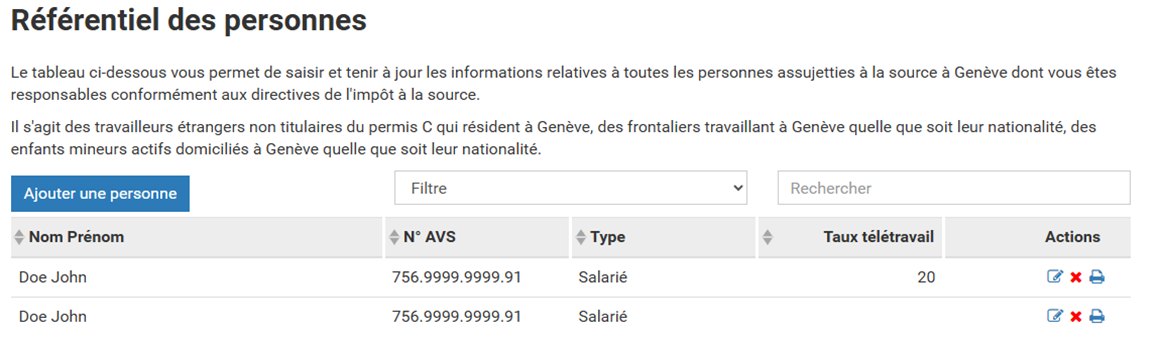 Si un employé déménage en cours d'année, de France en Suisse ou de Suisse en France, vous devez créer deux fois la personne dans votre référentiel des personnes: