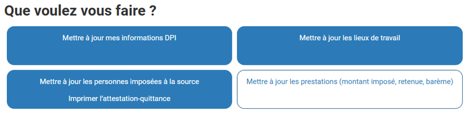 Après avoir terminé les salaires, et calculé l'impôt à la source prélevé aux personnes imposées à la source, sélectionner Mettre à jour les prestations.