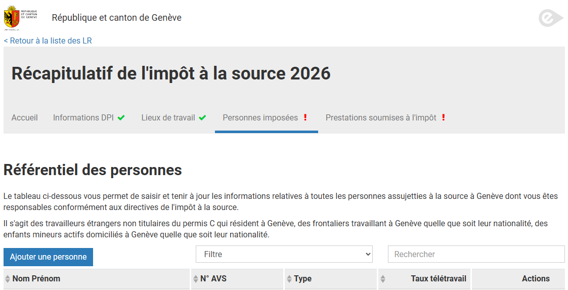 À noter que depuis la Révision de la loi sur l'impôt à la source, entrée en vigueur le 01.01.2021, seules les personnes domiciliées à Genève ou domiciliée à l'étranger et travaillant à Genève (frontalier) peuvent être déclarées à Genève. Les personnes domiciliées dans un autre canton doivent être déclarées directement auprès du canton de domicile.
