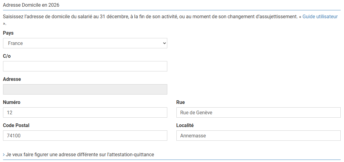 Ajouter l'adresse de domicile de la personne. Saisissez l’adresse de domicile du salarié au 31 décembre, à la fin de son activité, ou au moment de son changement d’assujettissement.