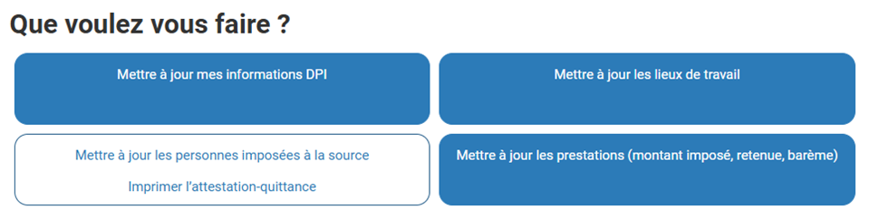 Sur la page d'accueil, sélectionner Mettre à jour les personnes imposées à la source / Imprimer l’attestation-quittance.