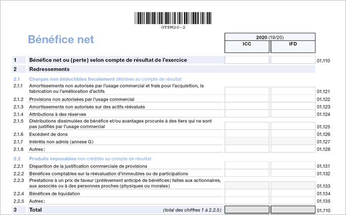 Indiquez le bénéfice net ou la perte de l’exercice clos durant l’année civile 2020 selon le solde du compte de résultat (sans y inclure le report de l’année précédente). L’exercice commercial constitue la période fiscale. Si l’exercice commercial comprend plus ou moins de 12 mois, il n’y a pas lieu de procéder à une annualisation pour le calcul du bénéfice imposable.