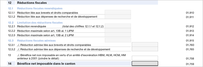 Pour la réduction liée aux dépenses de recherche et de développement, la réduction fiscale admise (chiffre 12.3) est ventilée proportionnellement au rapport entre la réduction revendiquée liée aux dépenses de recherche et de développement (chiffre 12.1.2) et la réduction fiscale totale revendiquée (chiffre 12.2.1).