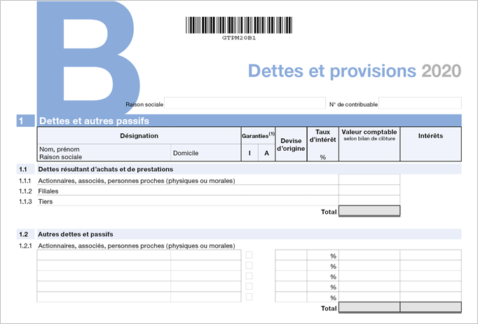Indiquez les autres dettes ne résultant pas d’achats et de prestations ainsi que les autres passifs, notamment les comptes de régularisation.