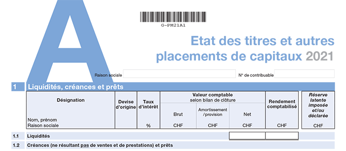 Pour les participations, actions ou titres cotés, indiquez le cours (hors bourse, le cas échéant) de clôture de la bourse des titres concernés à la date de la fin de l’exercice commercial (période fiscale). Cette information est disponible notamment dans la liste des cours de l’AFC, consultable sur Internet (www.estv.admin.ch), et auprès de Telekurs Financial. Pour les participations et actions non cotées, indiquez la valeur fiscale déterminée au moyen des instructions pour l’estimation des titres non cotés. Ces instructions sont disponibles sur Internet Pour les autres titres non cotés (2.3), indiquez la valeur vénale (valeur fiscale). Si les autres participations et actions (2.2) ou autres titres (2.3) n’ont pas été détaillés et que seul l’intitulé du poste au bilan est mentionné, indiquez la valeur fiscale de manière globale. |