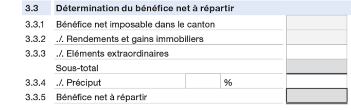 La part du capital propre imposable au taux ordinaire correspond à la différence entre le capital propre total imposable dans le canton (chiffre 2.2.1) et la part imposable au taux réduit (chiffre 2.2.3). Le total doit correspondre au chiffre 31.4 de la déclaration.