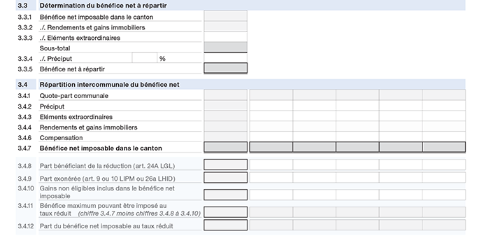 Le bénéfice maximum pouvant être imposé au taux réduit correspond au bénéfice net imposable (chiffre 3.4.7) moins la part bénéficiant de l'exonération au sens de l'art. 24A LGL (chiffre 3.4.8), moins la part exonérée au sens des art. 9 ou 10 LIPM ou 26a LHID (chiffre 3.4.9) et moins les gains non éligibles (chiffre 3.4.10). Indiquez ce montant pour chaque commune.