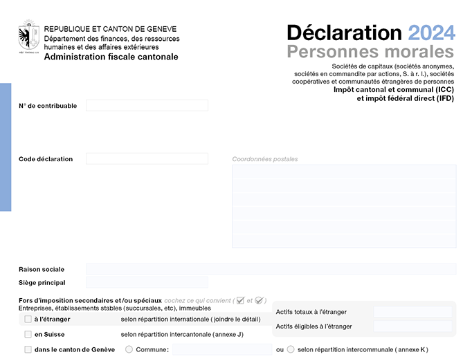 Cochez les cases "dans le canton de Genève" et "Commune" si votre société a son siège principal hors du canton de Genève et qu’elle n’a qu’un seul for d’imposition secondaire ou spécial dans le canton de Genève. Indiquez la commune du for d’imposition secondaire ou spécial situé dans le canton de Genève dans la case prévue à cet effet.