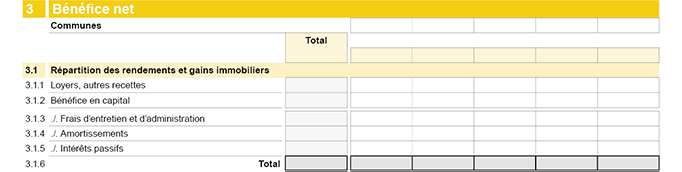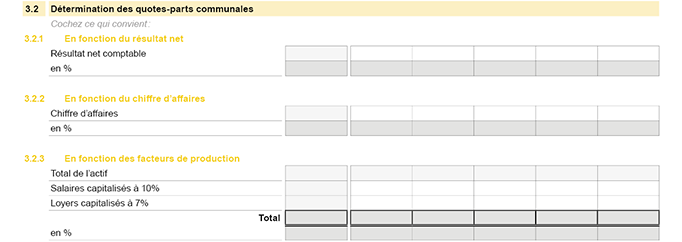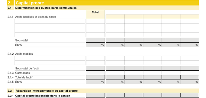 Reportez le capital propre imposable dans le canton (chiffre 22 de la déclaration) et appliquez les pourcentages des quotes-parts communales (chiffre 2.1.5).