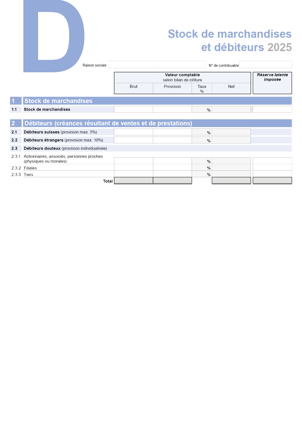 L’annexe D doit être remplie si votre société a un stock de marchandises ou des créances résultant de ventes ou de prestations. Les autres créances doivent être indiquées dans l’annexe A.