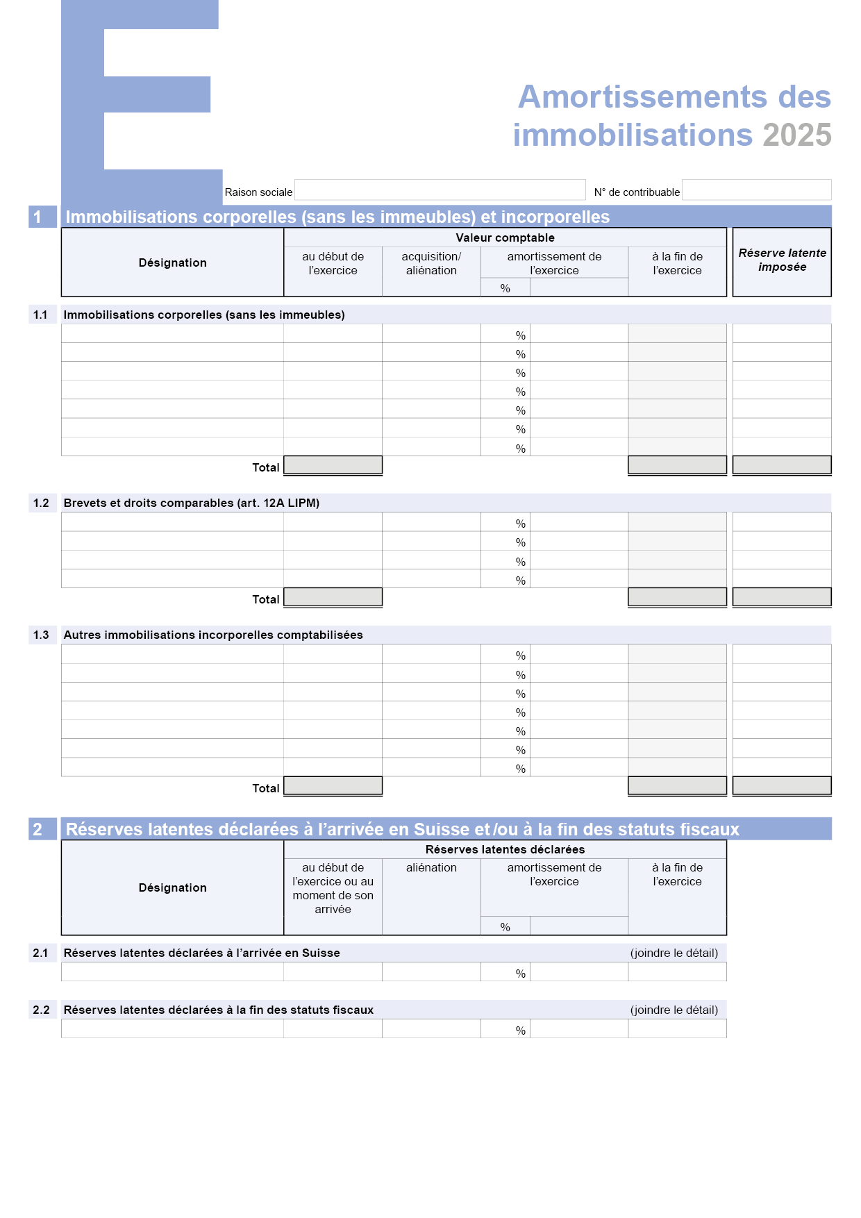 Annexe EAmortissements des immobilisations L’annexe E doit être remplie si votre société a des immobilisations corporelles (sans les immeubles) ou incorporelles. Cette annexe sert à donner des indications sur les amortissements.