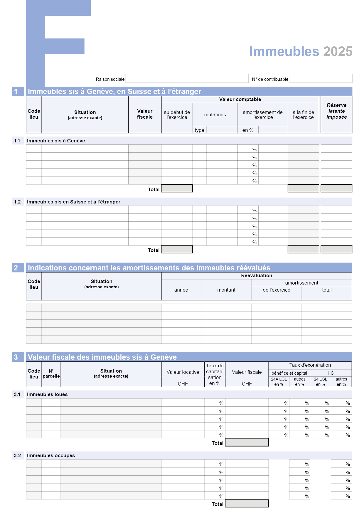 L’annexe F doit être remplie si votre société détient des immeubles (bâtiments, terrains, etc.) sis à Genève, en Suisse ou à l’étranger.