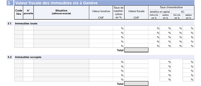 Si l’exercice commercial de votre société coïncide avec l’année civile, les taux de capitalisation des immeubles locatifs à utiliser sont ceux valables au 31 décembre 2025. Ces taux n’étaient pas encore fixés lors de la réalisation de ce guide. Dès qu’ils le seront, ceux-ci seront insérés dans le règlement d’application de la loi sur l’imposition des personnes physiques (RIPP) (disponible sur Internet silgeneve.ch – RSG D 3 08.01).