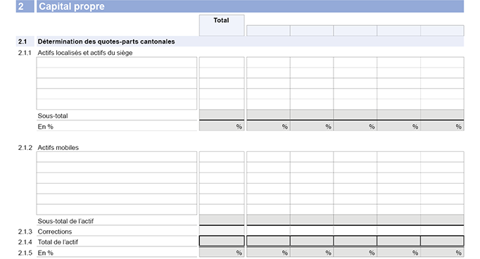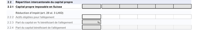 Dans la colonne "Total", appliquez le pourcentage déterminé au chiffre 2.2.3 au capital propre imposable en Suisse (chiffre 2.2.1), puis répartissez le montant obtenu entre les différents fors d'imposition proportionnellement aux actifs éligibles pour l'allègement (chiffre 2.2.2).