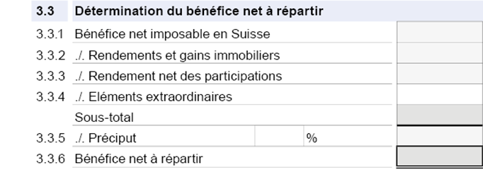 Dans le cadre de la répartition du bénéfice net, il convient de tenir compte de la réalisation de produits et de pertes extraordinaires liés à un transfert de siège (circulaire 17 du 27 novembre 2001 de la Conférence suisse des impôts). Le cas échéant, déduisez les bénéfices extraordinaires et / ou additionnez les pertes extraordinaires.