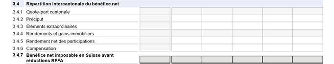 Si des redressements ou des déductions (chiffres 2 et 4 de la déclaration) sont directement attribuables aux fors secondaires ou au for principal, mais pas à toute l’entreprise, il convient de les indiquer afin de déterminer les quotes-parts cantonales.