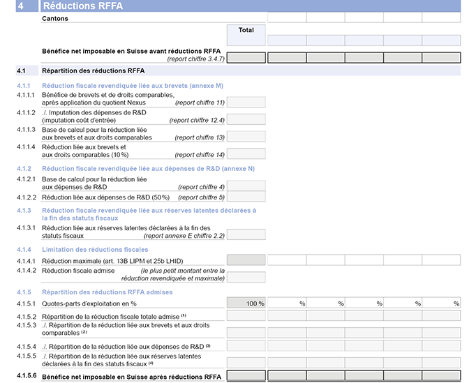 Pour la réduction liée aux réserves latentes déclarées à la fin des statuts fiscaux, la réduction fiscale totale admise (chiffre 4.1.5.2) est ventilée pour chaque canton proportionnellement au rapport entre la réduction revendiquée liée aux réserves latentes déclarées à la fin des statuts fiscaux (chiffre 4.1.3.1) et la réduction fiscale totale revendiquée (somme des chiffres 4.1.1.4, 4.1.2.2 et 4.1.3.1).