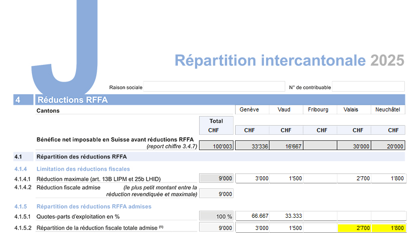 Si votre société a transféré son siège durant la période fiscale 2025, attribuez le préciput proportionnellement à la durée du rattachement personnel dans chaque canton de siège.