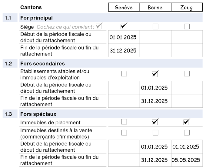 Indiquez les cantons où se trouvaient des établissements stables et/ou immeubles d’exploitation durant la période fiscale 2025 ainsi que les dates de début et fin de la période fiscale.
